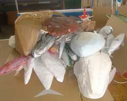 このサカナたちの無惨な姿。「サカナはここに置いて」と指示されたとおりに、どんどん積み重ねられてしまいました。「重ならないようにきれいに並べていき、場所がなくなったらこっちのテーブルに並べてね。」と指示すべきだったのです。