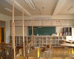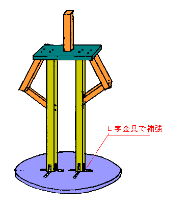 教室に柱を立てた−い! 問題点 場所が教室だけに床や天井に大きな傷がつくような行為は許されません。なにか不安定な物を立てるときに、あとのことを考えない方(生徒とは限らない…)は、荷造り用のビニール紐を布テープ(ガムテープともいう)でとめて上から吊るそうとしたり、石膏ボードの天井にネジを止めたりしてしまいます。天井は剥がれるわネジは外れてしまうわで文化祭どころの騒ぎではなくなってしまいます。 これで解決! 下の図は教室を縦にスライスした状態の断面図だと思ってください。鉄筋コンクリート造りの校舎ならば大抵は天井にコンクリートの梁(水平方向の柱)が出ています。その部分から床までの高さにピッタリ合わせた木材の角材を立ててください。多少は木材も凹んでしまうので1〜5ミリは長めの方がより丈夫になります。ピッタリと梁と床にはさまれた角材は、梁の近くか床の近くをハンマーでたたかない限りビクともしないぐらい見事に立っていますよ。角材はDIYセンターで1本400円程度で売っている「垂木」で充分です。学校の技術の先生に訊けばすぐに分かるはずです。
