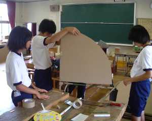 銀色の半球に見えるのは、体育館の通気口のキャップです。このキャップにダンボールを押し当てて、ガムテープでとめていきます。