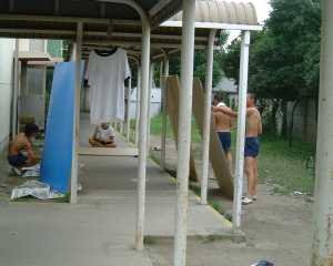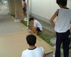 刷毛では難しいので、ローラーを使いました。それでもペンキが飛び散るというので、上半身はだかになってやっています。水性でも服に付いたらペンキは落ちません。
