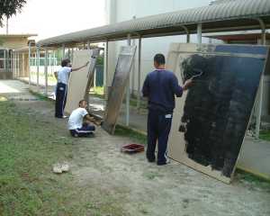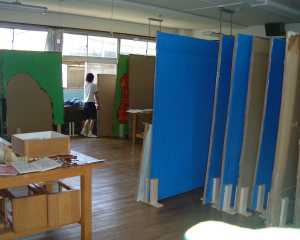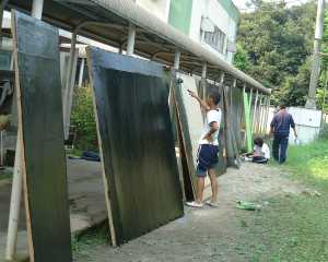 ペンキ塗りや補修が終わったパネルを並べています。全部で25枚あるので、普通教室よりも一回り大きい金工室でも一杯になってしまいます。 |