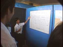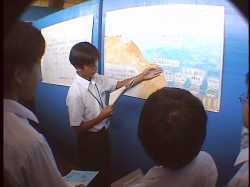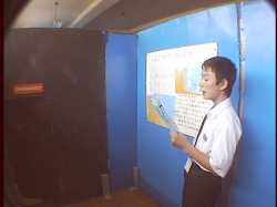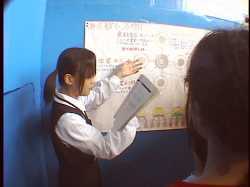 海底都市の説明図の前に案内して、指を指しながら
