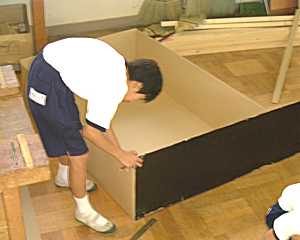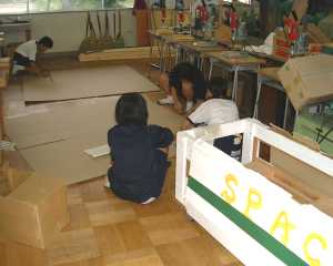 手前の3人は去年の文化祭で「モノレール」として活躍した乗り物を「3人乗りのカメさん」に改造しようとしています。