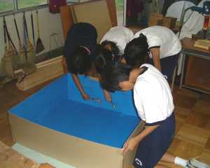 少し大きめの「マダイ」と「マグロ」を発泡スチロールで作っています。この2人は私が大まかな形を作って渡すと上手にカッターナイフを使って削っていました。