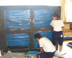 これはモデルルームから見える窓の外(深海の世界)をつくるケースです。去年の「Goodbye my EARTH」では地球に帰還したときの宇宙になったケースを今年は青に塗り替えて使用する予定です。