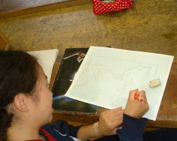 パネル画のデザインを考えています。ミスプリントの裏などを使って大体の構成を考えてから、コピー用紙に描いていきます。ここでも「地球にやさしい」取り組みを忘れてはいません。 |