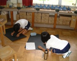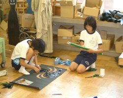 前日準備の様子。廊下が展覧会の会場にみえるでしょう?平均10分の待ち時間を飽きさせないための工夫です。 |