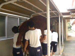 体長4メートル巨大マンモス模型の製作 その4 文化祭の2日前の夜8時30分、最後の吹き付け塗装が終了しました。木工室の窓からマンモスを撮影しました。明日の準備を静かに待ちます。 文化祭前日準備。 いよいよ教室へ運び込みます。本体の重量は男子生徒2人で軽々と持ち上げられる程度ですが、いざ運ぶとなると先導係を含めて10名が関わる一大イベントとなりました。 展示会場である教室で、サーベルタイガーと再び出会うマンモス。蛍光灯は外されてスポットライトに照らされています。 マンモスはダンボールシートに発泡スチロールの粉を木工用接着剤で吹き付けた土台に置きました。雪面の表情が良い感じに表現されています。 夜の8時30分、マンモスくんに新しい友達が出来ました。マンモス、サーベルタイガー、女の子の赤ちゃん…そうです!映画「アイスエイジ」の再現です。ということは手前の少年はナマケモノの「シド」ですか。 このあと、文化祭当日の朝をむかえるまで黙々と孤独だけれど充実感いっぱいの作業が続きます。クラスのみなさんが登校するまでに、更にひと工夫を加えておくのです。 いよいよ次回は、文化祭当日の様子です。 おたのしみに! もどる
