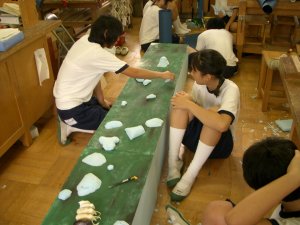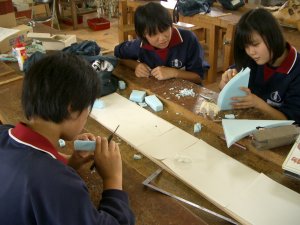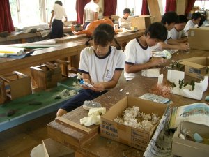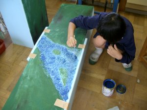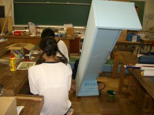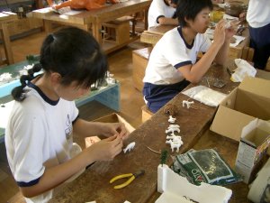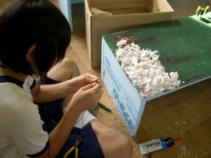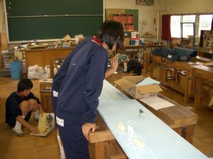 幅3.6メートル氷河期ジオラマ模型の製作 幅3.6メートル、奥行き45センチ、厚さ20ミリのスチレンボードにチョークで大まかなレイアウトを描いていきます。試作品のミニチュアマンモスの群れを置いて、イメージをふくらませていきます。 川になる部分を半田ごてで溶かします。ジューという心地よい(?)音がします。うっかり深く溶かしすぎると修正が難しい、慎重さと大胆さが試され作業です。 レイアウトパネルは2分割式で、一つがこの画像のような形になっています。これは巨大マンモスの背景となる部分なので、高さを観客の視線(いすに座ったときに、ちょうど目の高さにあるように設置する予定)にあわせる必要があるからです。 山などの凸部分の地形はスチレンボードを使って丁寧に一つずつ作ってきます。静電気を帯びたカスが手やジャージに付いて、深呼吸すると鼻の中に入ってくるという状況での作業が続きます。 全体を草原のイメージに塗装(水性ペンキを使いました)してから、さきほどの凸部分のパーツを乗せています。バランスよく置けたら、木工用接着剤で固定します。 川の部分は丁寧に刷毛で塗装します。実はこの塗装の前に、透明のレジンキャストを流し込む作業をしたのですが、スチレンボードが溶けてしまって大騒ぎしてしまいました。両サイドに仮留めしているガムテープがその騒ぎの後を物語っています。の 同時進行でオオツノジカを作っていきます。この作業は文化祭直前の作業のため、ミニチュアマンモスのような複製品づくりはできないので、一つ一つ紙粘土で作ります。表情が全部違うので、群れにしたときに迫力があります。 さらに同時進行で、樹木を作っていきます。この制作法は「アマゾン探険館」で開発したもので、何年ぶりかで役に立っています。ビニル被膜コードの心線に雪状にした発泡スチロールを付けて仕上げます。 雪景色の森を作っています。幹はコードの心線の束なので、スチレンボードにブスッと刺すことはできますが、念のためにゴム系接着剤を塗りながらの作業となります。 レイアウトボードのつなぎ目の処理は慎重に行います。観客がつなぎ目を意識しないで見ることができれば成功です。 こちらが文化祭当日の様子です。見事にマンモスの背景にとけ込んでいます。 もどる