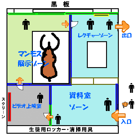 @入口 A資料 室ゾーン Bビデオ上映室 Cマンモス展示ゾーン Dレクチャーゾーン