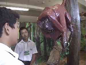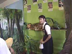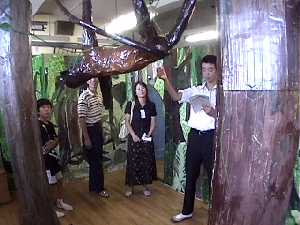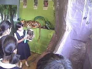 大木に案内する。 「熱帯雨林といえども、これだけ大きな木は今ではなかなか見当たりませ ん。熱帯林の大きな特徴は、このように根が板のように付いていることで す。これは熱帯雨林の土がわずか20センチ余りという、とても薄い土の 層に根を張らなければならないためで、この大木が倒れた写真をみても分 かるように、根は本当に浅く生えているだけなのです。このことから、熱 帯雨林の豊かさは、とても微妙なバランスの上に成り立っているというこ とが分かりますね。」 オセロットを指して 「こちらはオセロットという、ネコ科の動物です。同じく熱帯雨林に住ん でいるジャガーと比べると、家ネコに近い感じがしますね。でも先ほどご 覧になったサルやキンカジューたちも、オセロットから見るとごちそうな んですよ。」 資料室入り口へ案内して 「ではなごり惜しいところでしょうが、この辺で熱帯雨林からさよならを していただいて、資料室へとお進みください。」