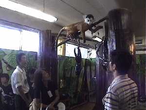 ツアー客が入ってきたら 「熱帯雨林にようこそ。まずみなさんを歓迎していますのは、ホエザルで す。実はホエザルはなわばりに進入してきたみなさんを警戒して吠えている んですね。かまれないように気をつけてください。」 クモザルを指して 「こちらのクモザルは、手足がクモのように長いのが特徴です。指はご覧の 通り4本しかないのですが、その分、しっぽが器用に動くので便利なんです よ。みなさんに歓迎の握手を求めていますね。どうぞ握手してあげてくださ い。」 握手しようとしたら 「ああ、かまれる!……って大丈夫ですよ。」 キンカジューを指して 「このかわいらしい動物はキンカジューといいます。サルの仲間ではなくて アライグマに近いそうです。かわいらしい顔を是非近くで見てあげてくださ い。」 のぞき込んでいたら 「あっ、かむので気をつけてください。…うそです。あまーいくだものが大 好物の人なつっこい動物なんです。」