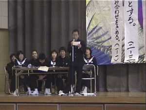 ここで紹介する生徒総会は、春日部市立東中学校で毎年行われているものです。生徒総会に参加することで、討議の方法と、他人の意見を尊重することを学びます。「予算の取り合い」は省いて、テーマや方針についてのみ話し合われます。