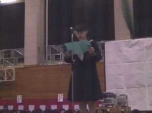 体育館の中央にセットされた舞台は、生徒用机6脚と畳を積み重ねて作りました。